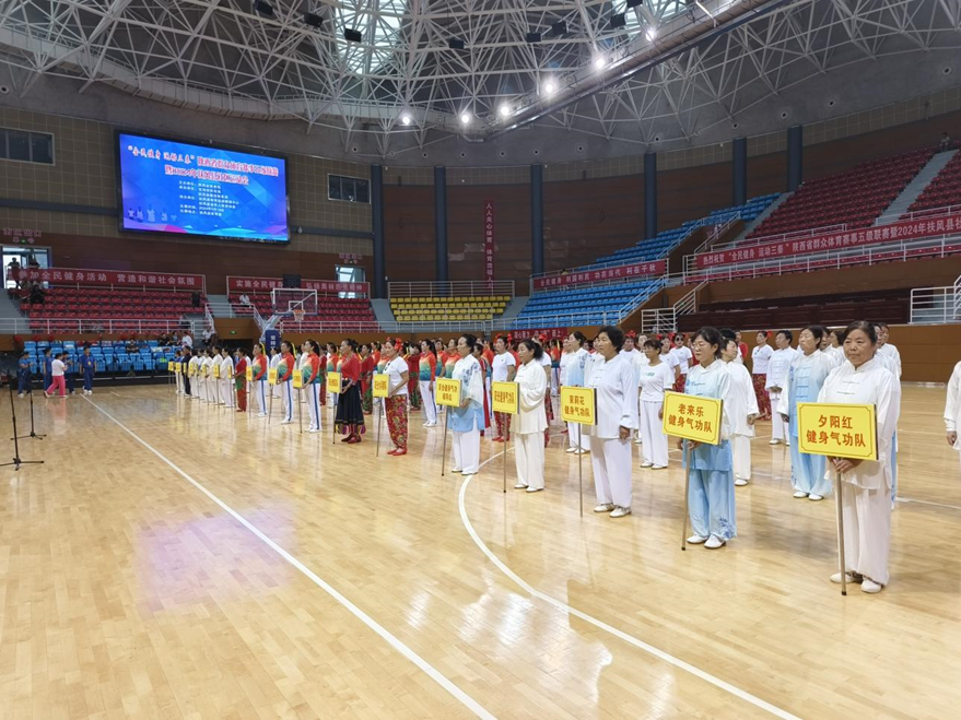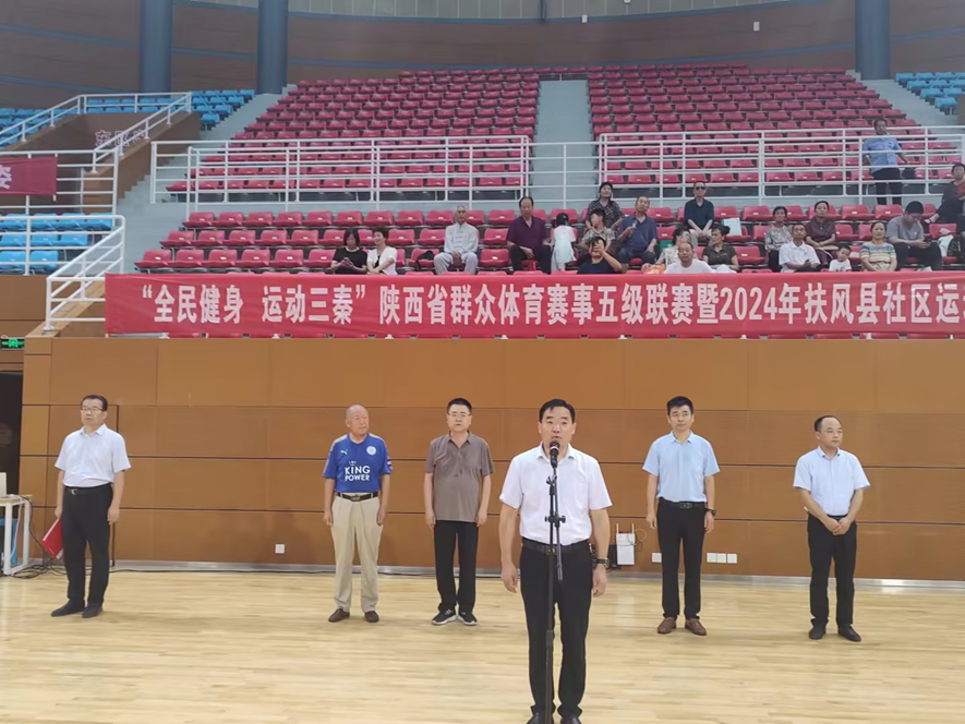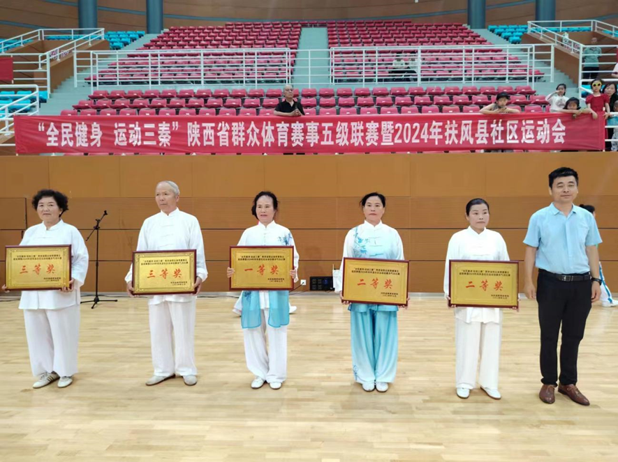 “全民健身 运动三秦”陕西省群众体育赛事五级联赛暨2024年扶风县社区运动会7月19日在县体育馆举行。共有来自全县各个社区19支代表队220余人参加了比赛。比赛分广场舞、健身气功、太极拳和柔力球四个项目进行。