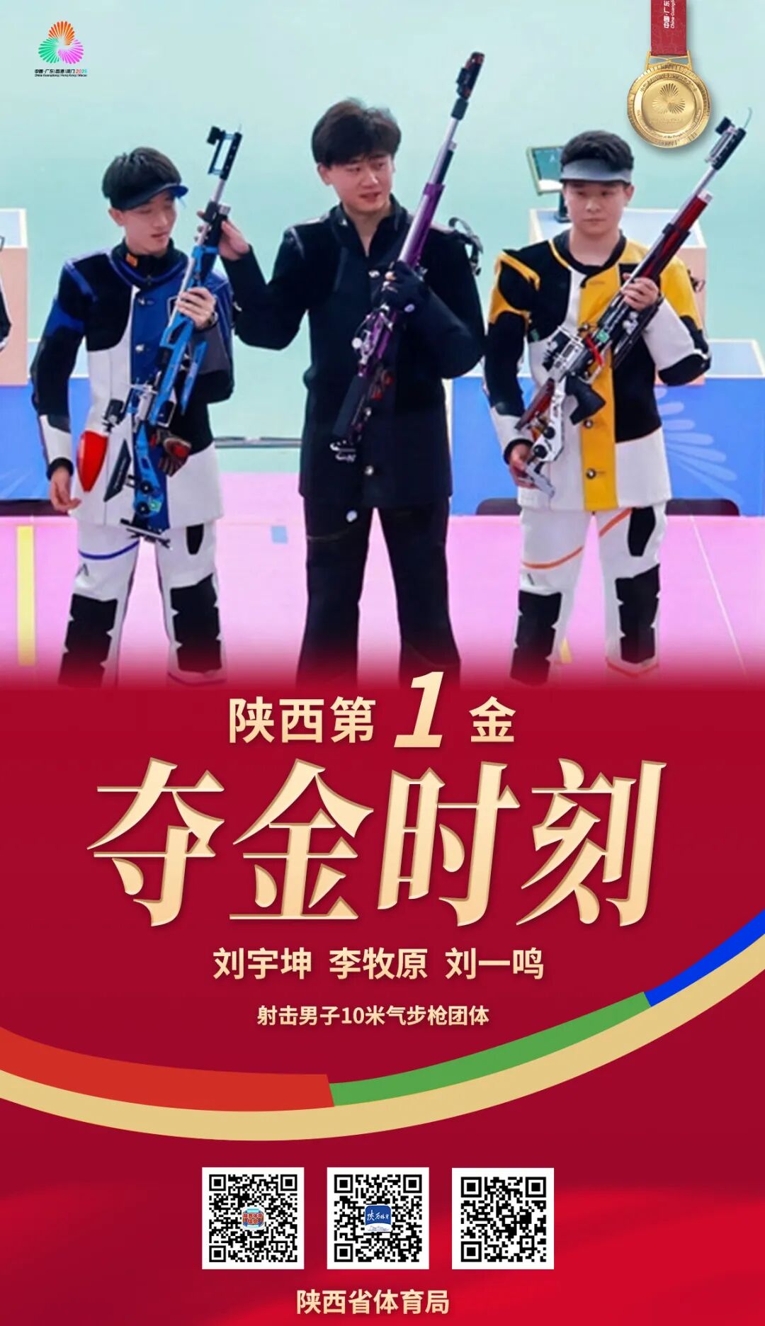 欣闻在第十五届全国运动会男子10米气步枪团体决赛中,我省运动员刘宇坤、李牧原、刘一鸣夺得冠军,为陕西体育代表团赢得本届全运会首枚金牌!在此,省委和省政府向你们及刘宇坤、李牧原、刘一鸣同志表示热烈祝贺,向我省全体运动员、教练员和工作人员致以亲切慰问!希望我省参赛运动员以勇立潮头、争当时代弄潮儿的志向和气魄,再接再厉,奋勇争先,在本届全运会上夺取更加优异的成绩,为谱写陕西新篇、争做西部示范贡献体育力量!