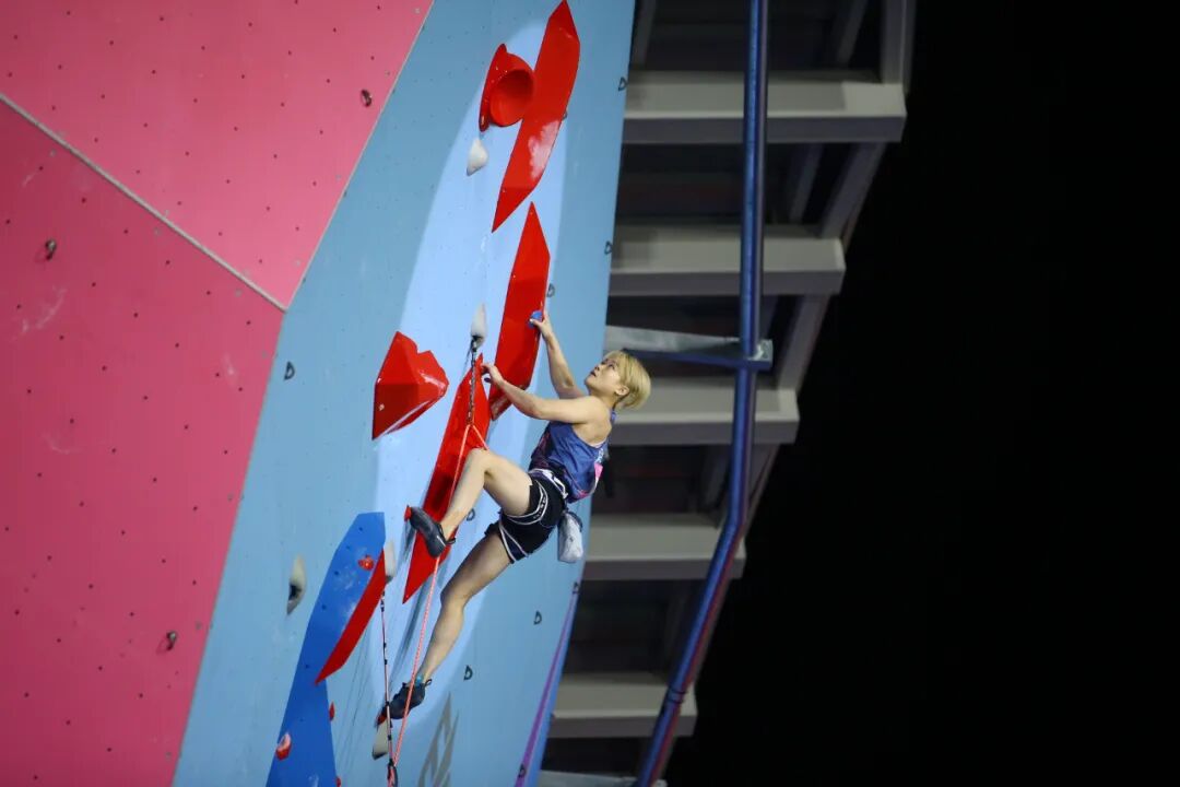 在随后进行的女子难度决赛中,骆知鹭在参加决赛的8名选手中也是第5位出场。在女子难度决赛的线路上,巧妙设置了一个接近于攀石的难度点,即第28号支点。这里需要双手抓握第27号点,通过核心力量上收下肢,倒悬取得平衡后,抓握上方支点,这对参赛选手的核心控制力和爆发力都提出了比较高的要求。此前出场的4位选手均在此处铩羽而归,骆知鹭上行至此处时,一鼓作气,快速通过,直至上行到第52号支点,抓握第53号支点时脱手坠落,整体用时4分42秒。随后出场的贵州卢一镜与骆知鹭在预赛中并列第三,也是在第28号支点,她努力做出多轮尝试,力竭而脱。倒数第2个出场的是在预赛中完攀的广东张悦彤,虽然上行速度较慢,但凭借较强的攀爬耐力,她稳健通过第28号支点,最终达到与骆知鹭相同的高度,整体用时超过5分钟。最后一个出场的广东选手李美妮,与张悦彤在预赛中并列第一,在决赛中同样受到第28号支点的挑战,耗费了较大体力,最终只上行到第47号支点,继续上攻时滑脱。按照竞赛规则,决赛成绩相同,取预赛成绩好者获胜,最终张悦彤胜出。