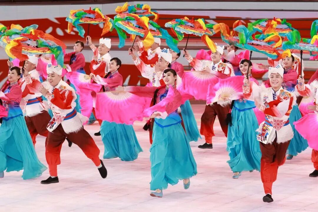 上篇《古脉新承》以“冰雪”为韵,描绘了一幅“大美陕西”的人文风情画卷,迎接全省冬运健儿热情欢聚。在《冬日映三秦》的节目中,冰花窗前映照着千年冬韵,新春乐曲呼唤着归乡游子。这场跨越山海的相聚,是冰雪联结的情谊,更是三秦大地敞开胸怀的赤诚盛情。最令人惊艳的是《潮音贯古今》中的“三秦风物展”,地面投影化作一幅百米冰雪长卷:陕南的腊肉暖锅雾气蒸腾,关中的羊肉泡馍香气仿佛穿透屏幕,陕北的黄米馍馍金黄诱人;羌族雪纹刺绣、冰上皮影戏、雪花剪纸渐次绽放。当舌尖品味烟火、指尖流淌传奇,传统与现代晕染出浓浓冬韵,文化自信在这片热土上蓬勃生长。