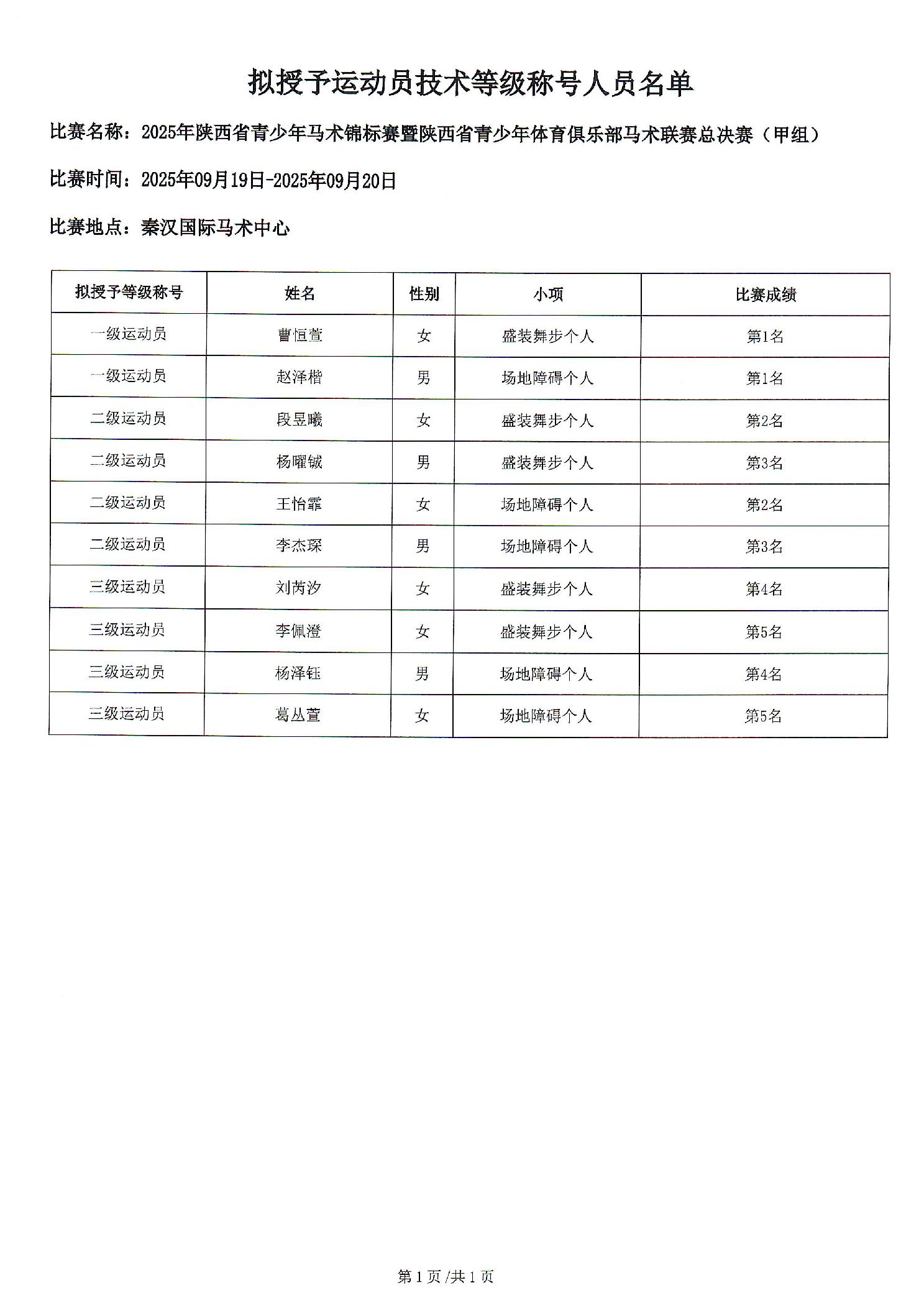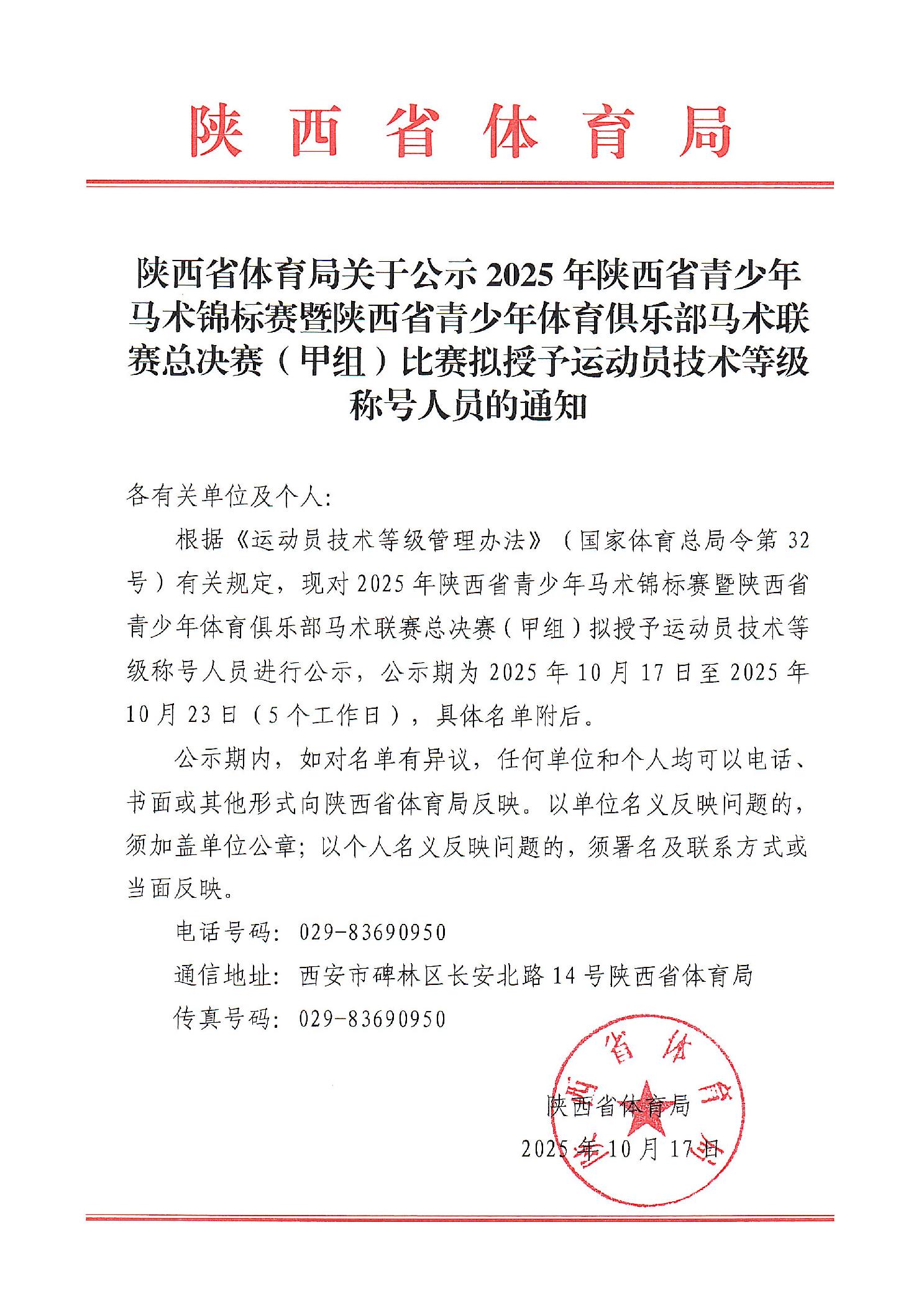 陕西省体育局关于公示 2025 年陕西省青少年马术锦标赛暨陕西省青少年体育俱乐部马术联赛总决赛(甲组)比赛拟授予运动员技术等级称号人员的通知