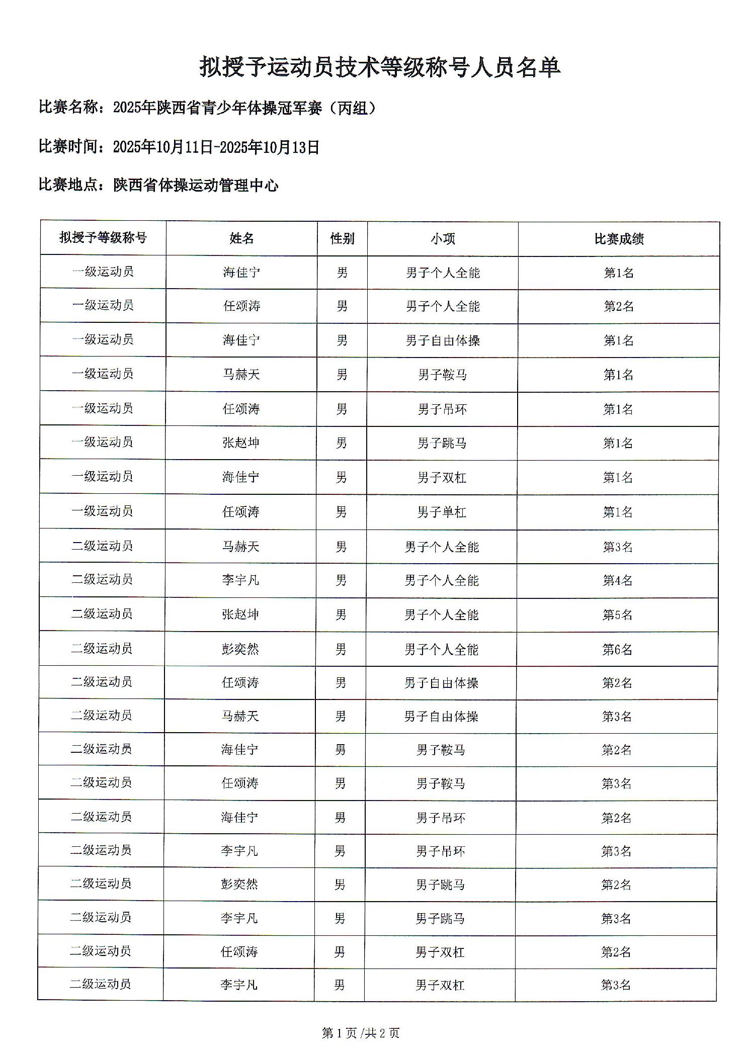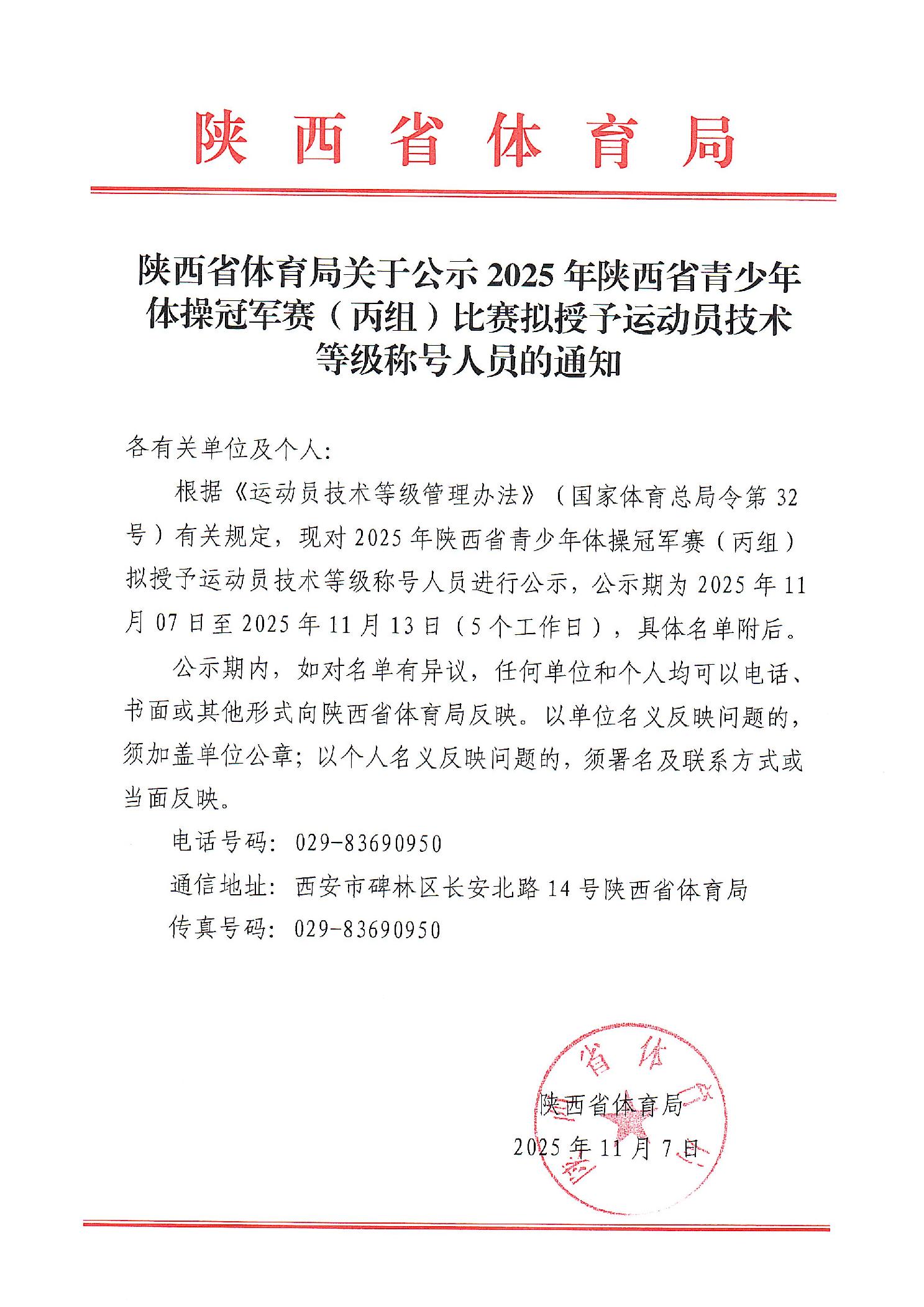 陕西省体育局关于公示2025年陕西省青少年体操冠军赛(丙组)比赛拟授予运动员技术等级称号人员的通知