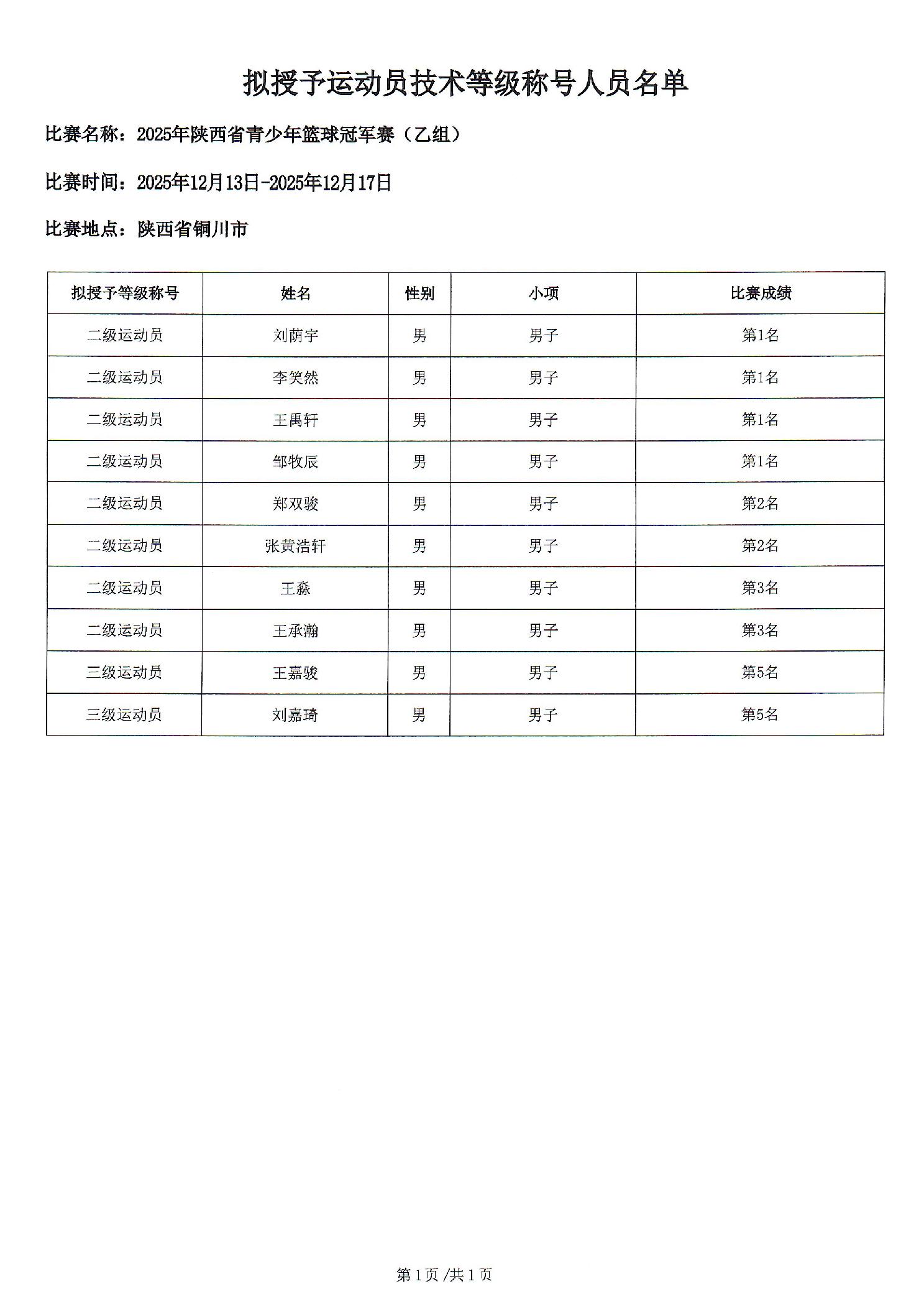 陕西省体育局关于公示2025年陕西省青少年篮球冠军赛(乙组)比赛拟授予运动员技术等级称号人员的通知